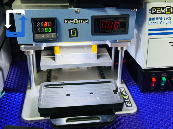 На iPhone мы прожимаем проклейки с нагревом. А на Андроидах — дисплей после установки на термоклей. Просто положили, пресс прогрел дисплей и усадил его в корпус так, что клей равномерно распределился, ну а дальше в печку.
