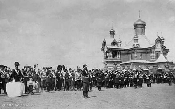 Снимок сделан в 1896 году. Николай II выпивает чарку водки на Ходынке перед военным парадом 1896 года. На заднем плане храм преподобного Сергия Радонежского.