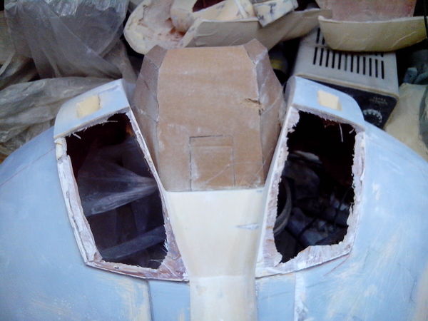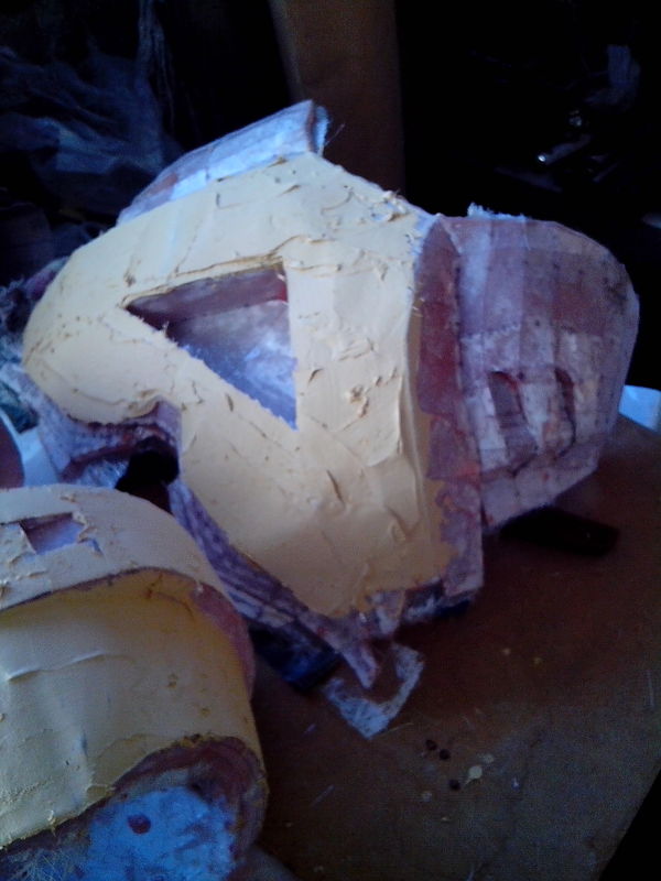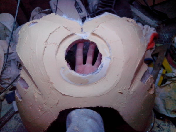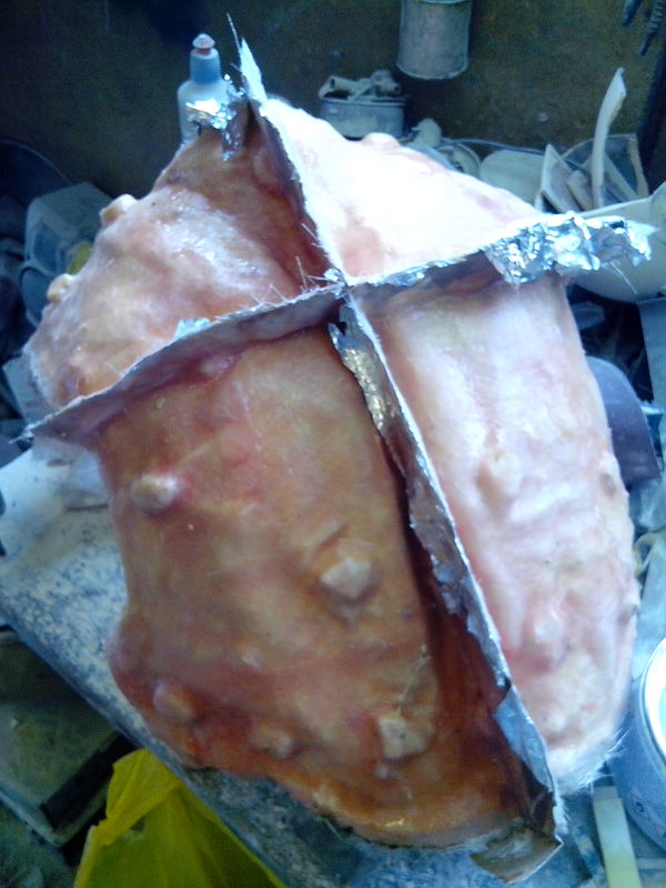 на фото грудь склеена со спиной воедино для того что бы в дальнейшем после полного укрепления и разъединения эти две детали стыковались между собой . установлены распорки изготовленные из пвх . пользовался как и в прошлый раз смолой фирмы novol. покупал литровые банки .по идее было бы проще и дешевле заказать 10 литровой бочкой с инета , но мы же лёгких путей не ищем) я не упущу возможности усложнить себе жизнь , к сожалению )