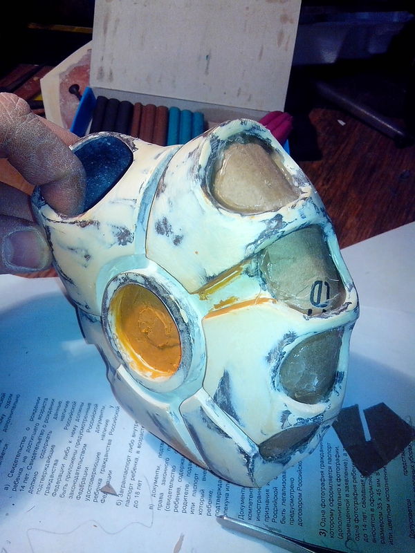 шлем покрашен , сделал эффект типа немного горелого забрала ) осталось собрать систему поднятия забрала и свет из глаз запилить )