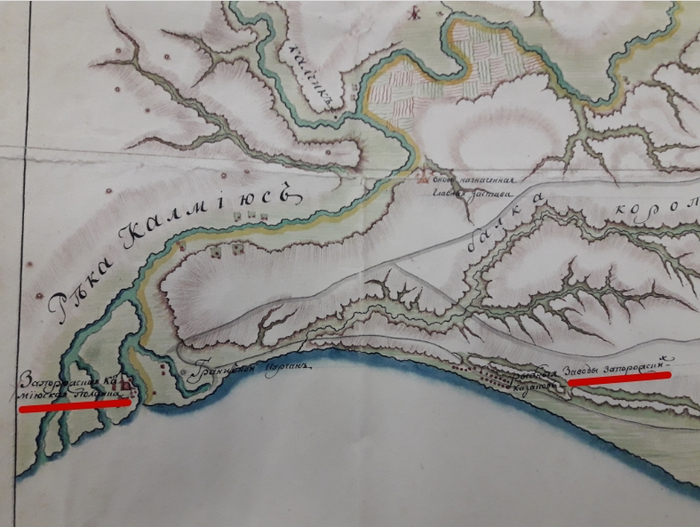 По имеющейся на ней информации она довольно близка по дате к карте Ригельмана, на ней также много внимания уделяется расположению рыбных заводов на побережье, в Кальмиусской паланке уже нанесена церковь. Карта охватывает полосу побережья от Кальмиуса и до Самбека и примерно 25 верст шириной. Кальмиусская паланка здесь также показана на уже знакомом нам месте – в низине у устья реки. Вверх по Кальмиусу в некоторых местах показаны хапоожские пашни и хутора причем показаны они на обоих берегах реки.