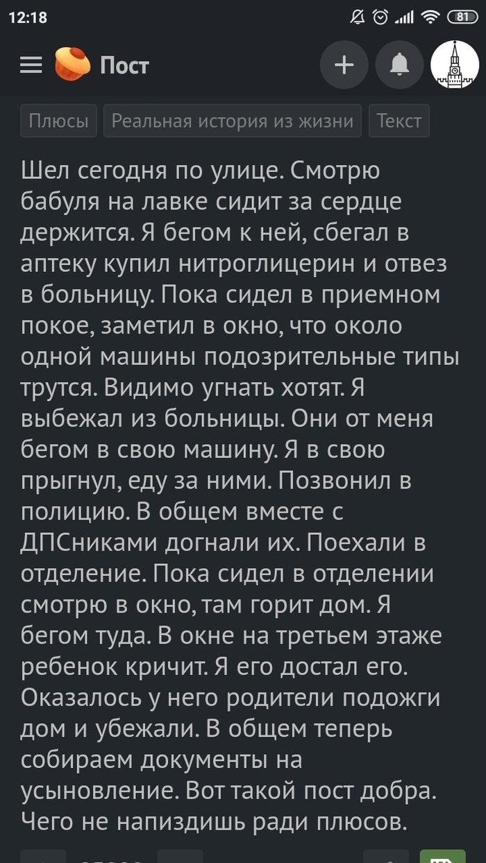 У нас на Пикабу есть ряд крутых авторов короткого рассказа, которые честно ставят тег "Авторский рассказ". Иногда по заголовку не понятно и можно спутать с реальной историей, но тег есть. Или иногда это рассказы всегда только в тему какой-то волны. Но тег есть! Это честно по отношению к читателю и по отношению к другим авторам. Например, есть такие товарищи: @Bladerunner42, @AlexBessonov, @LostShadow (есть ещё где-то 3-4 реально крупных автора, покидайте в комменты профили и позовите их, пожалуйста). Их творчество может нравиться или не нравиться, но они честны и могут привлечь внимание публики (то есть нельзя сказать, что пост с тегом "Авторский рассказ" соберёт меньше плюсов, если тот написан хорошо).