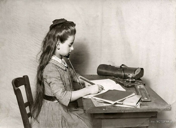 Демонстрация специальной подставки для подбородка, которая должна помочь сохранить правильную осанку и не испортить зрение во время письма, 1913 год.