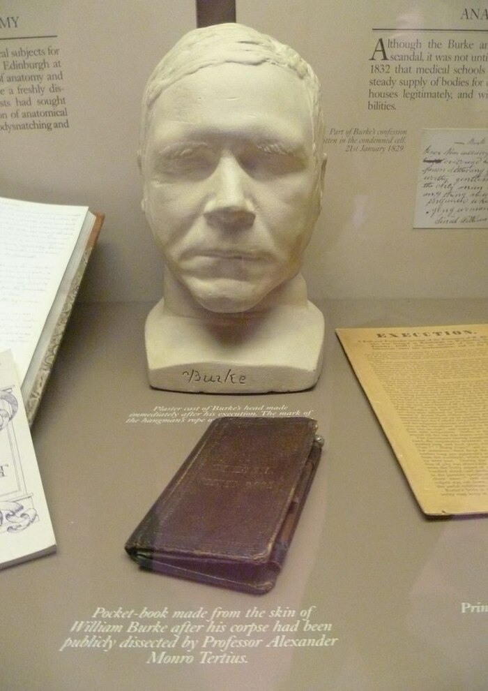 Книга, переплетённая кожей серийного убийцы XIX века Уильяма Бёрка, выставленная в Зале хирургов в Эдинбурге. Шотландия.