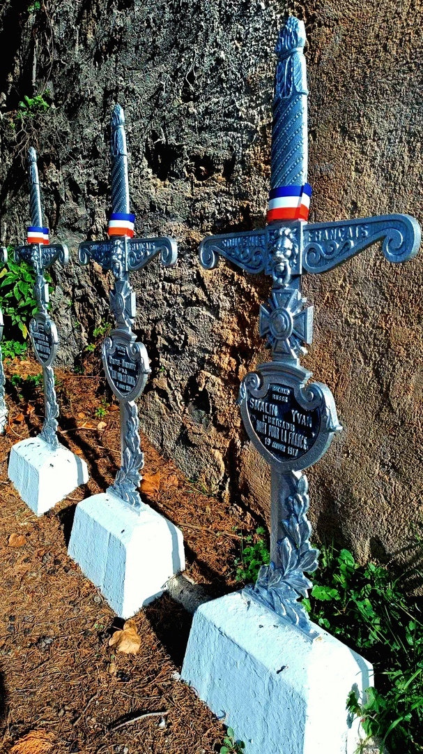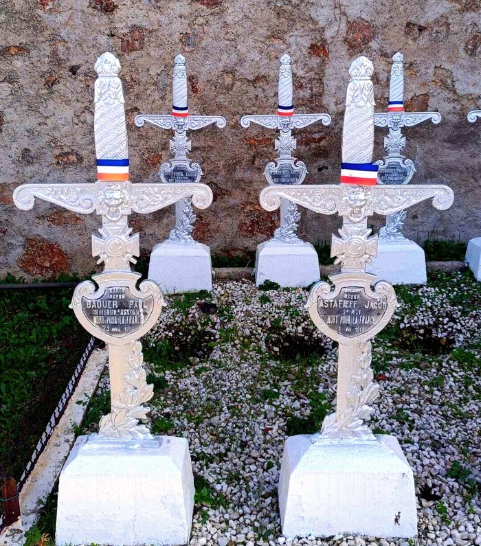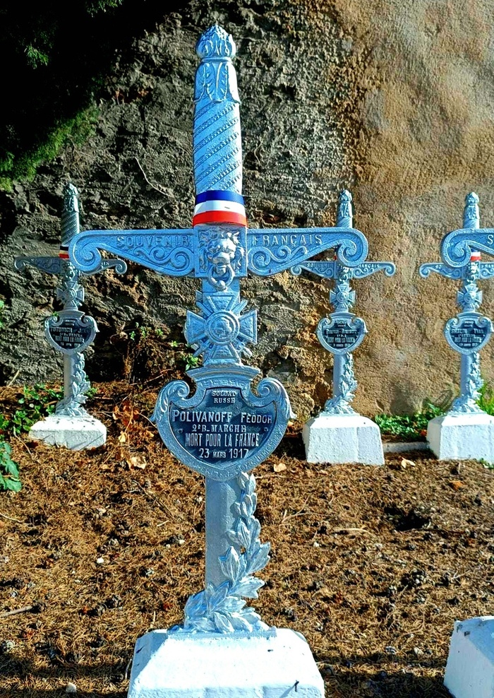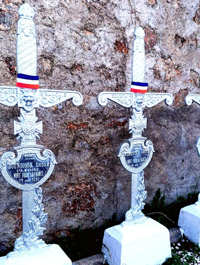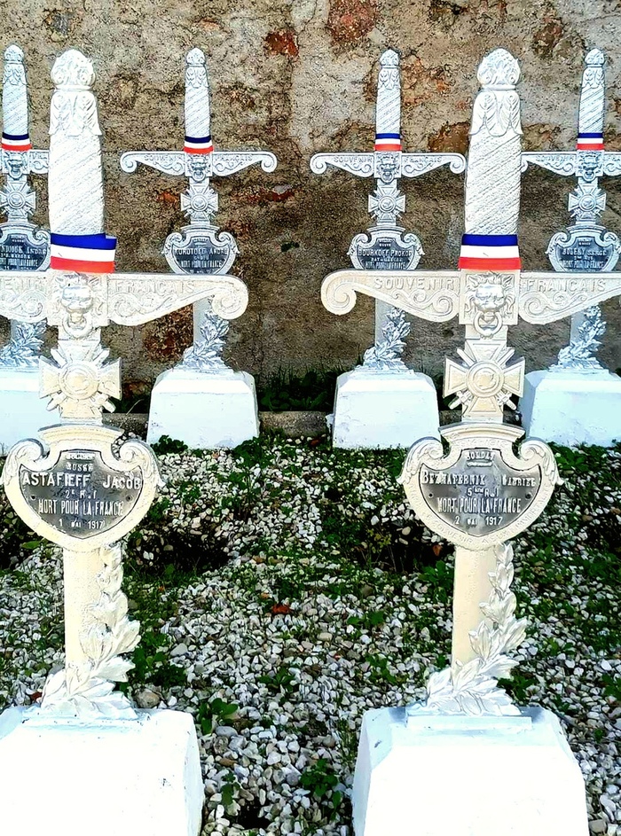 Флаг на крестах не французский, а так называемый панславянский. Панславянские цвета, были утверждены 1848 году Пражским славянским конгрессом на основе российского флага. Сейчас эти цвета во флаге используют Россия, Чехия, Словакия, Хорватия, Сербия, Словения