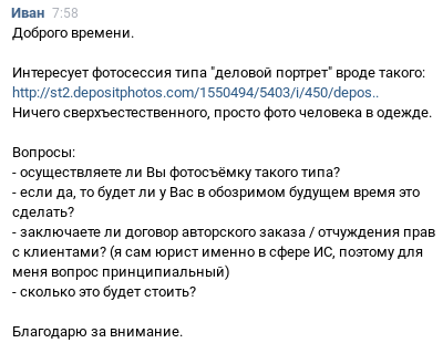 Меня интересовала портретная фотосъёмка, что я сразу указывал. Для лучшего понимания прикрепил ссылку на картинку как образец того, что я хочу получить, ну и само собой, я хотел быть правообладателем тех фото, за которые заплачу - поэтому соответствующий договор был обязателен (который, разумеется, я сам уже подготовил - ведь это часть моей работы).