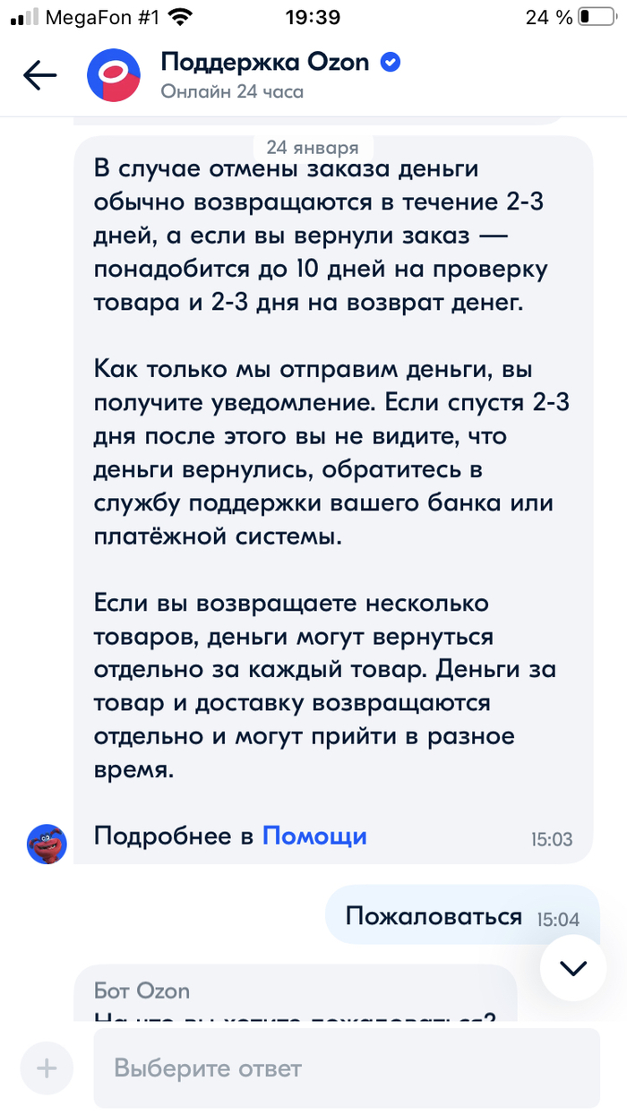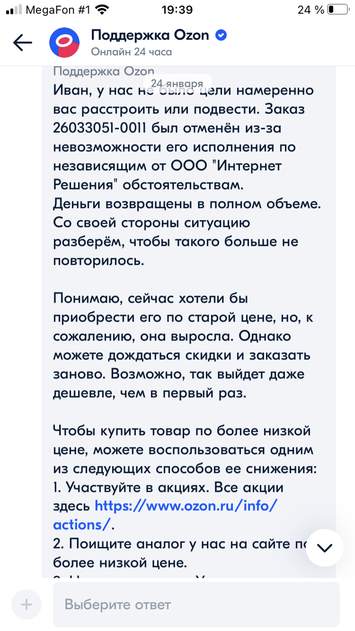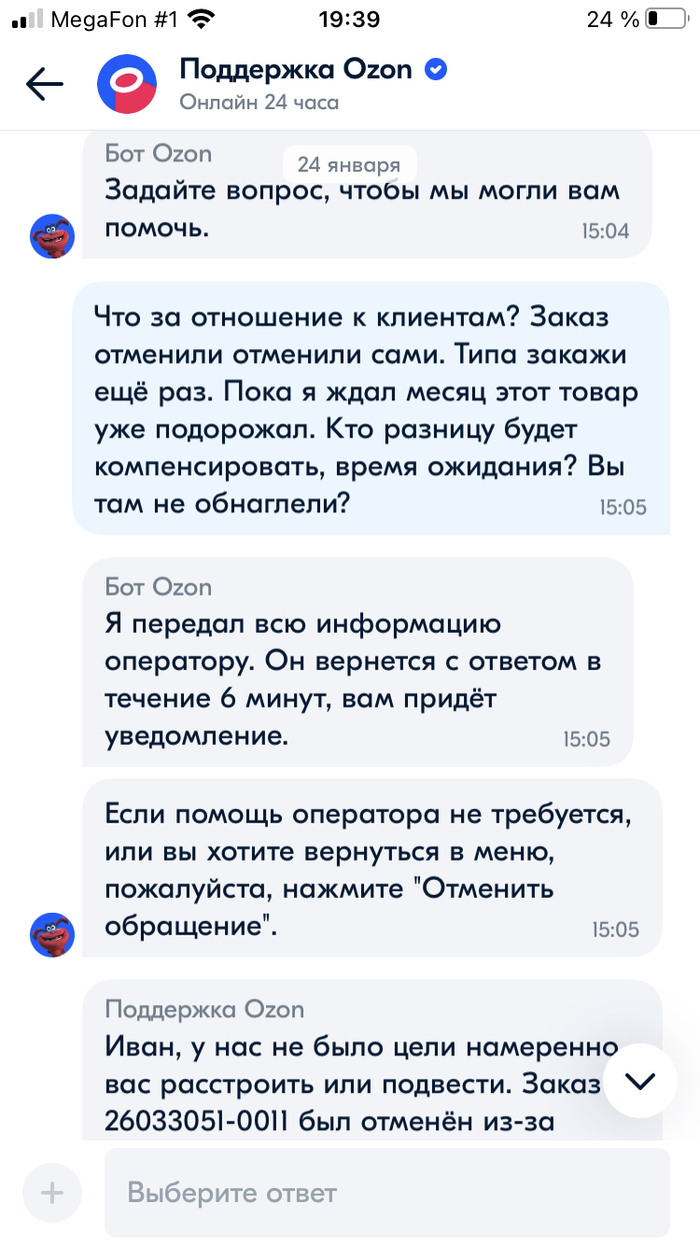 В ответ на комментарии на этот пост решил рассказать про свою ситуацию. Тоже сегодня столкнулся с говноподдержкой на @Ozon Заказывал собаке ошейник 29 декабря. Несколько раз доставку переносили. Сегодня пишу в чат где заказ то мой? Так в чате поддержка без моего согласия заказ отменила, деньги вернули и говорят попробуй-ка ты милок по новому заказать, может на этот раз не обосремся. Ошейник за месяц подорожал уже. Так на все мои претензии, что надо бы разницу вернуть, чтобы я новый заказал и задержку компенсировать летели шаблон за шаблоном. Вот про 2-3 дня прислали раза 4. Всю переписку не стал скринить, там все равно одно и тоже. Хотел написать отзыв на ошейник, что не доставили вовремя, отзыв отклонили. А у продавца между прочим стоит, что 100% доставка вовремя, что является обманом.