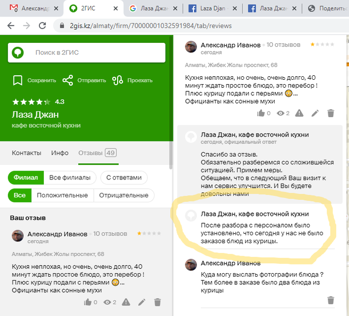 Но не в этом суть моей злости, я решил оставить отзыв о данном заведении на платформе 2GIS https://go.2gis.com/6psc59 Где мне официальный аккаунт ответил что сегодня заказов из курицы не было 😆🤓...