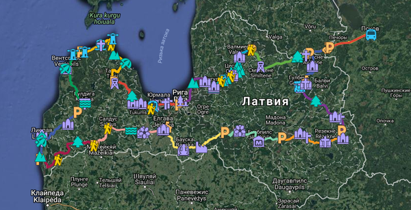 Началось наше путешествие с составления маршрута. Вооружившись туристическими ресурсами Латвии (такими как latvia.travel), я начал изучать достопримечательности и наносить их на карту (на движке Мои карты от Google). И потом уже начал эти точки соединять, прокладывая маршрут. А планы между тем были амбициозные: за 2 недели летнего отпуска объехать практически всю Латвию.