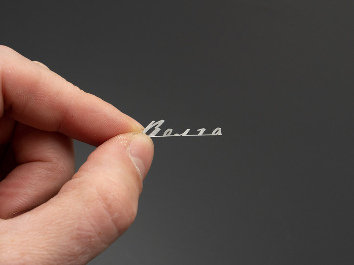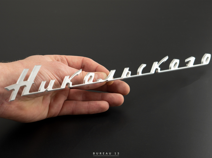 Энтузиаст стоит проект на базе Волги, попросил сделать свою надпись в стиле оригинальной волговской надписи. Крепится на штифтах.