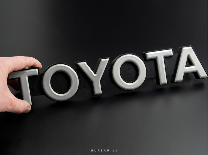Эмблема на гриль Toyota Land Cruiser 70. Со слов клиента не купить. Сзади 4 винта М5, шляпки спрятаны под буквами. Металл + пластик.