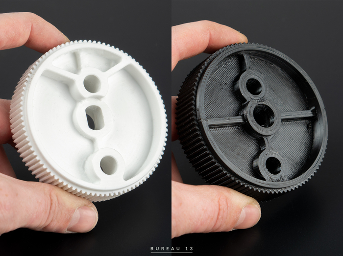 Слева шестерня дорогая фрезерованная с правильной эвольвентой и общей верной геометрией, а справа 3д печать, думаю, что разницу наглядно видно. Заказчик эксперементировал. Результат такой, что 3д печать сожрало, а фрезерованная продолжает работать как положено. Часто клиенты жалуются, что у нас стоит 5 рублей, а вот там делают за 1 рубль, вы оборзели, «разность технологий» — говорим мы.