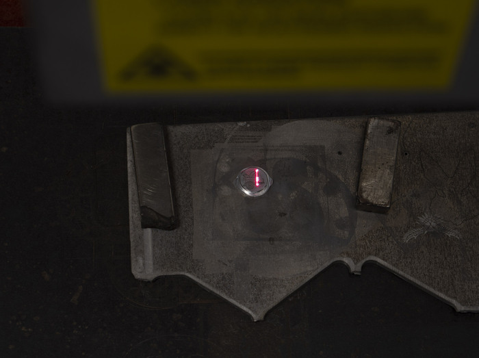 Гравировка на «Золотой рельсе». Подарок какому-то боссу. Очень тяжелая вещица, латунь, гравировка 300 мм шириной, оптоволоконный лазер.