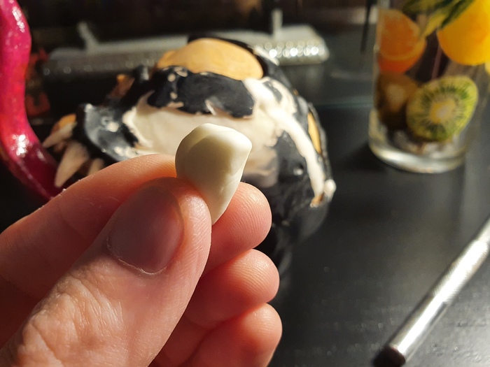 Третьим пунктом шло то, что масса при застывании деформируетсяи выгибается. В результате она отслоилась от пластмассвого черепа. Этот момент я так же решил устранить.