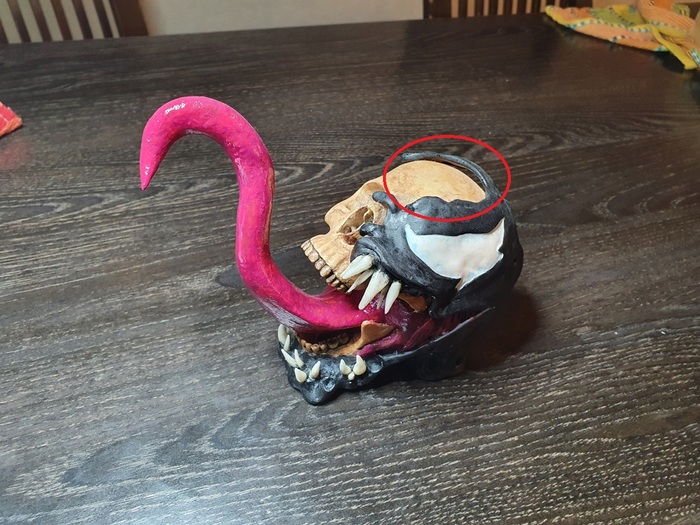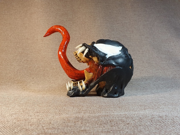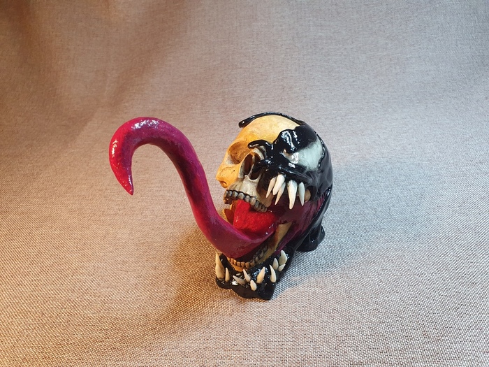 Красил кистью, художественным акрилом. Для блеска покрыл Венома несколькими слоями прозрачного лака для ногтей. Человеческий череп остался матовым.