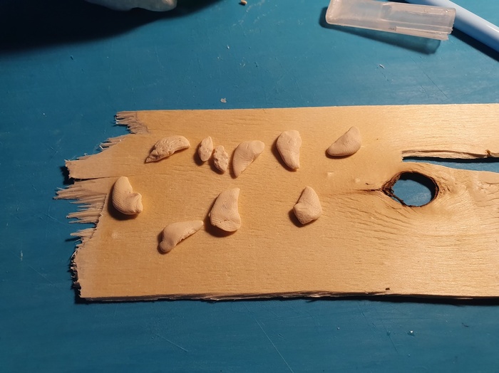 Налепляю немного массы и вклеиваю в неё клыки.