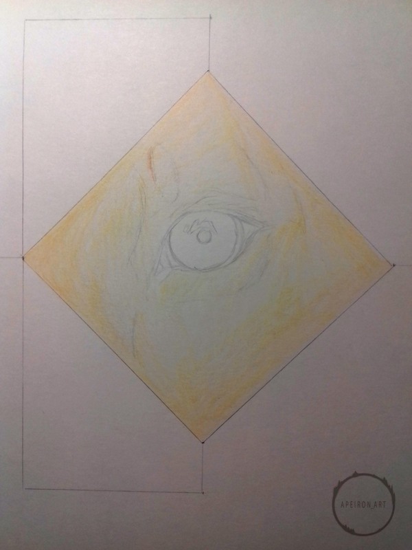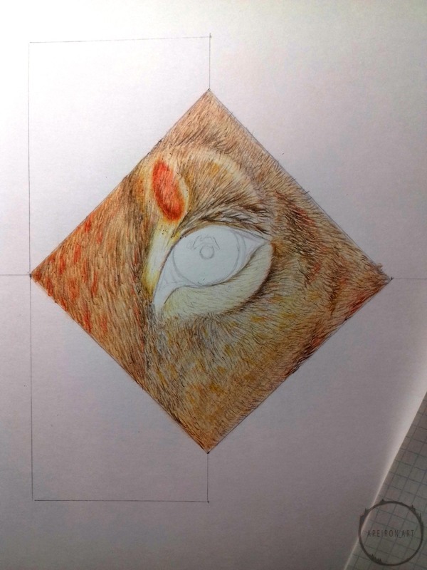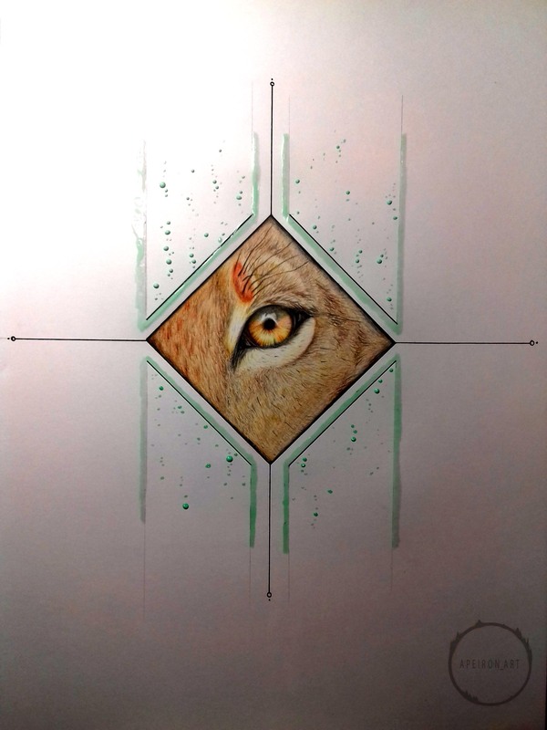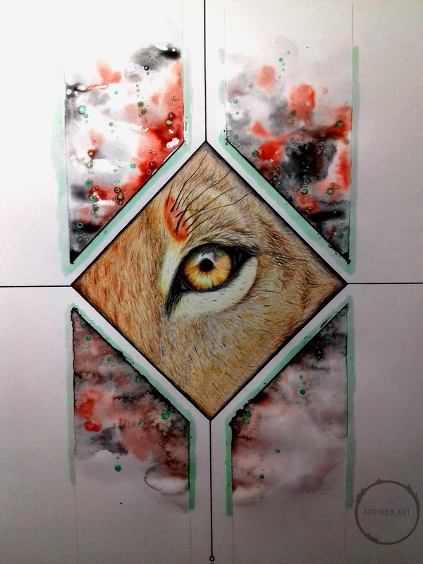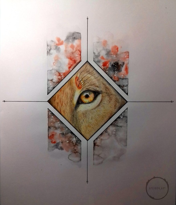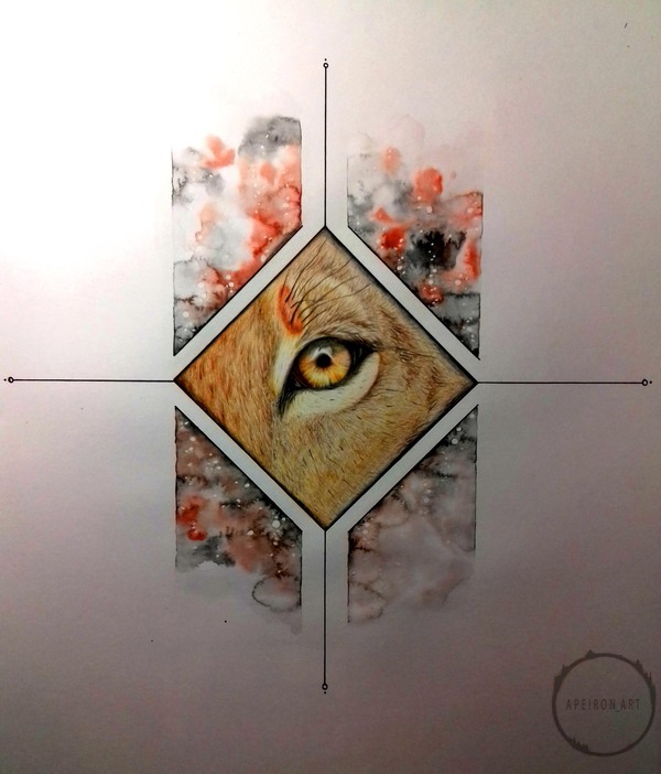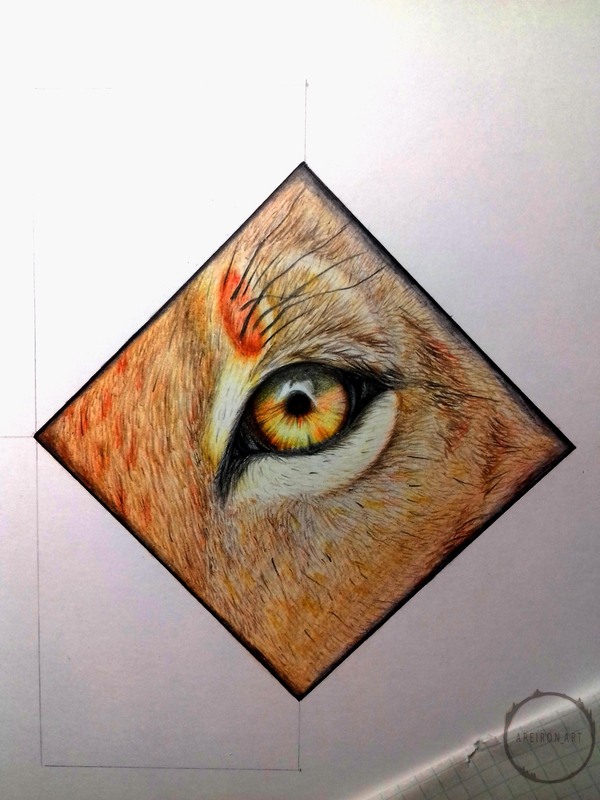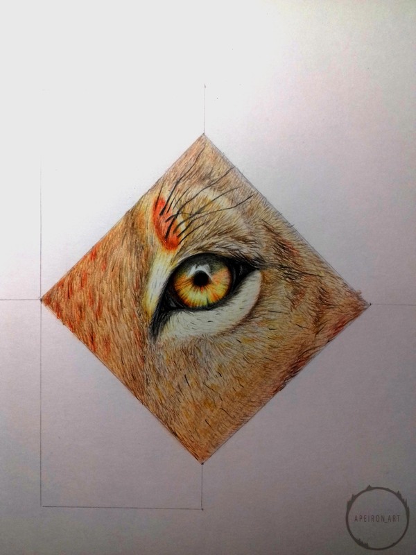 Задумал я на недалёкое будущее рисовать животных, да не простых, а с дополнительным оформлением, но для начала нужно было попытаться изобразить короткую шерсть, которую раньше рисовать не пытался. Сформировалась небольшая идейка - часть морды львицы, та, что с глазом, ибо глаза рисовать я люблю и умею. Чтобы не оставлять на бумаге просто часть морды, оформил это дело в ромбик, а дальше уже, так сказать, от балды придумал остальное оформление, ибо цель была только в опробовании умения рисовать шерсть. Далее фото процесса в несколько этапов, подписывать этапы не буду, т.к. думаю, что всё интуитивно понятно, но если у кого-нибудь возникнут вопросы, с радостью на них отвечу в комментариях.