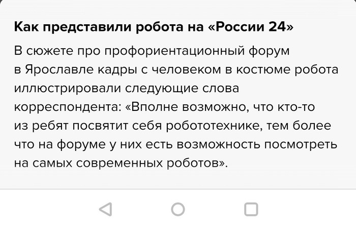 Телеканал «Россия 24» показал сюжет о форуме «ПроеКТОриЯ», который проводится в Ярославле. В сюжете рассказывается о «самом современном роботе» Борисе, которым оказался одетый в костюм человек. На это обратил внимание один из читателей TJournal.