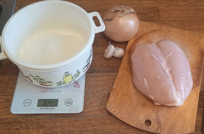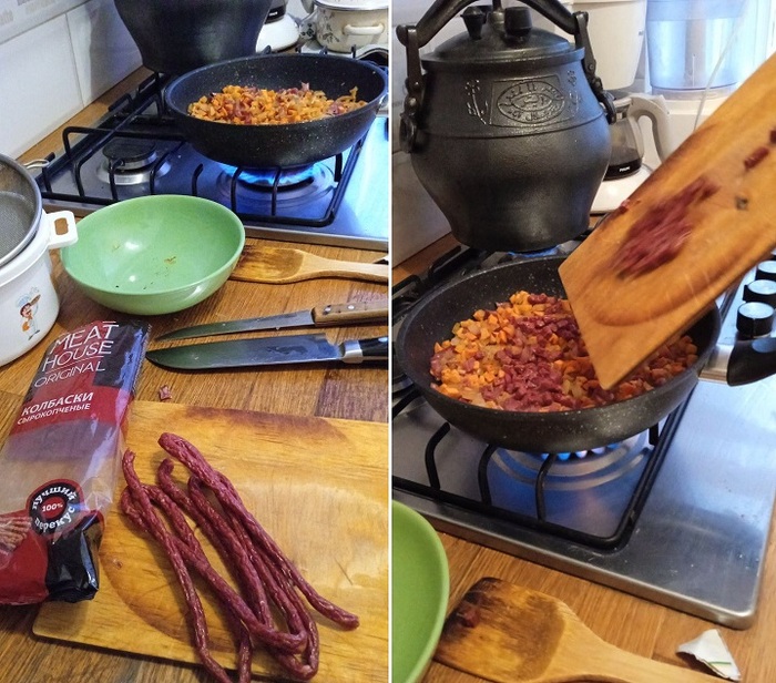 - 200г любой жирной колбасы, которая ВАМ НРАВИТСЯ (сегодня взял 150г сырокопченой и 50г колбасок)