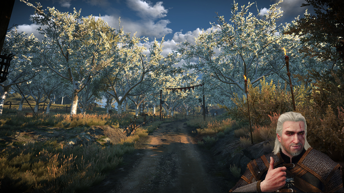 Скачал картинку из локации "Белый сад". Вырезал Геральта с большим пальцем. Вставил. И поставил на обои. С плавной сменой в 20 секунд. И смело пошёл спать.