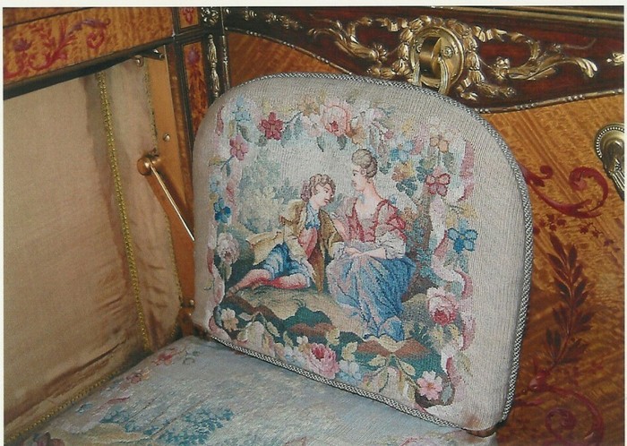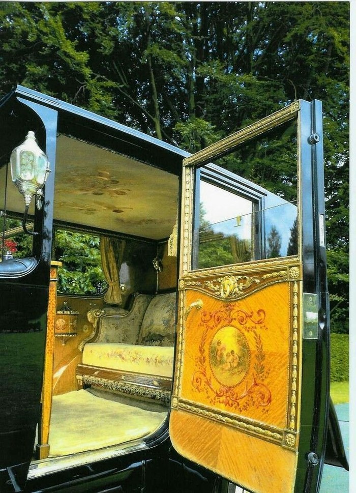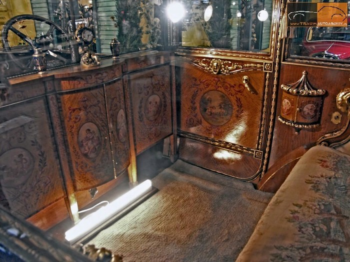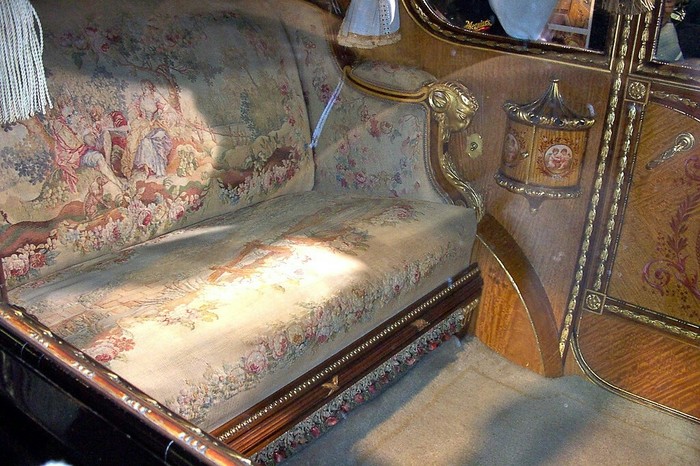 Интересно, что пассажирский закрытый салон функционально разделён на две зоны: задняя, с роскошным диваном и бархатными шторками - для хозяйки. А передняя, у дверей, оснащена двумя довольно скромными складными сидушками-страпонтенами, явно для прислуги. Промеж этих сидушек обустроен бар, напоминающий старинный комод, и пышные часы позолоченной бронзы.