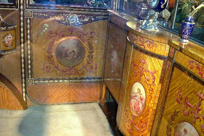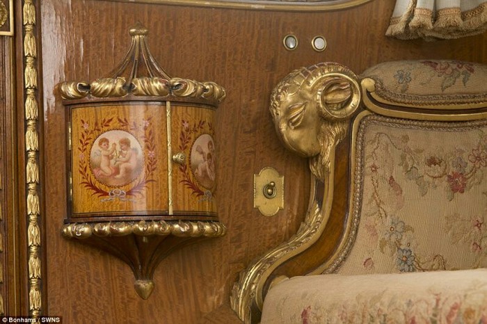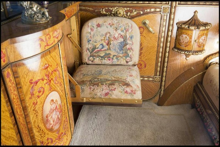 В заднем отсеке также установлен барный шкаф, двери облицованы панелями из красного дерева, установлены французские часы из золоченной бронзы, фарфоровые вазы с каждой стороны и шкафчик для макияжа.