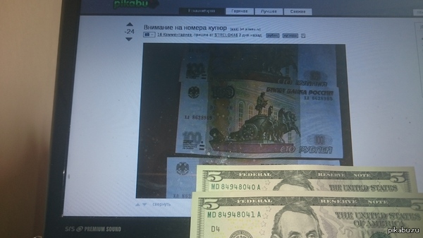 jdfrag Внимание на номера купюр 10 лет назад В ответ на http://pikabu.ru/story/_3580293 Доллары Рубль Купюра Ответ