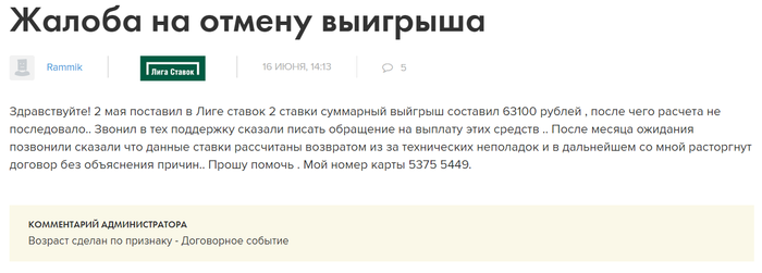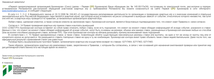 То есть выплат из фонда, который гарантирует выплату выигрыша игрокам, никогда не было! Может ошибка? Обращаемся в СРО, ведь нам не платит букмекер по надуманной причине. Получаем ответ, что всё нормально и законно, ведь ты принял правила букмекерской конторы при регистрации, а там сказано, что можно не платить.