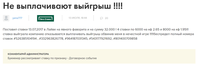 Поймите. Речь не идёт обо мне (мне, конечно, тоже некоторые букмекеры не заплатили по разным события), речь идёт о несправедливости государственного масштаба!