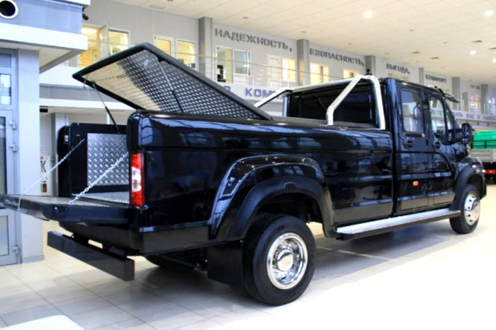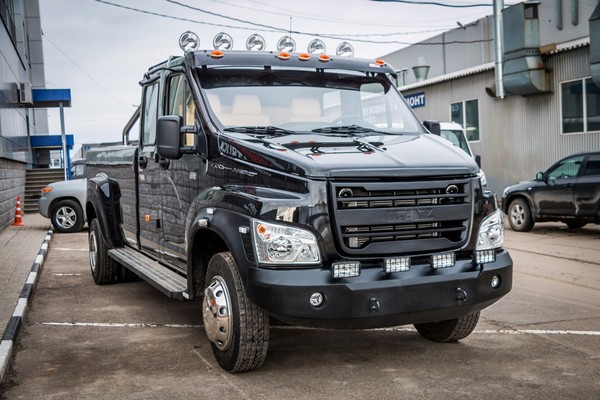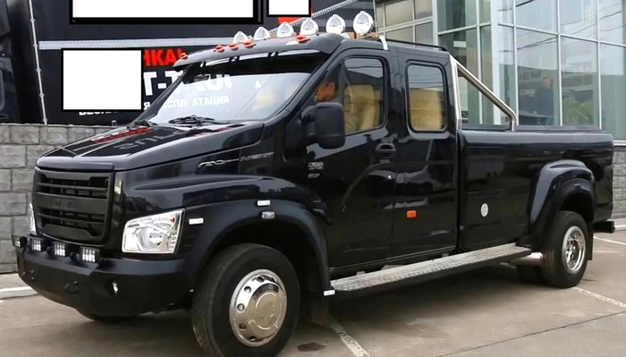 Автомобиль был изготовлен по заказу управления делами президента РФ к выставке "Импортозамещение-2015". За основу "луидоровцы" взяли серийный "ГАЗон Next" с двухрядной кабиной и превратили его в люксовый пикап а-ля "трак американо".