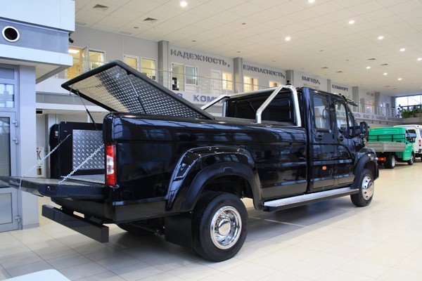 Монстроподобный "ГАЗон Next Pick-UP" поражал своими габаритами (7200х2300х2450 мм), возможностями (грузоподъемность до 5 тонн, да еще прицеп весом до 8 тонн!) и богатой комплектацией: белый кожаный салон, мультимедийная система с навигацией, акустика премиум-класса, система кондиционирования, круиз-контроль, электрические стеклоподъемники, противотуманные фары, зеркала с электрокорректором и подогревом, дисковые пневмотормоза WABCO, системы ABS, ASR. Правда, под капотом остался стандартный 148,9-сильный дизель ЯМЗ-53441.