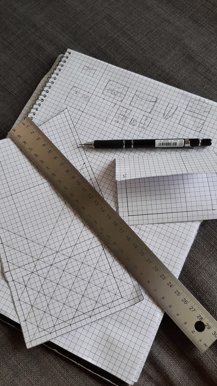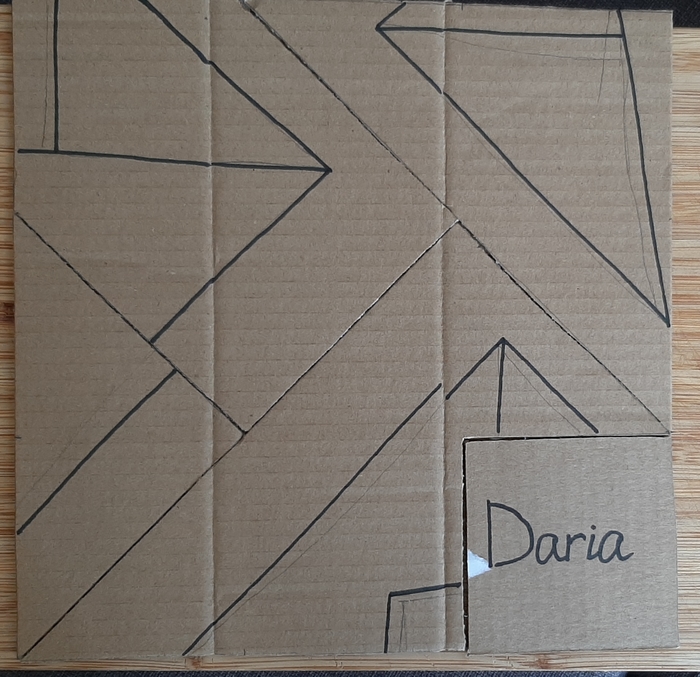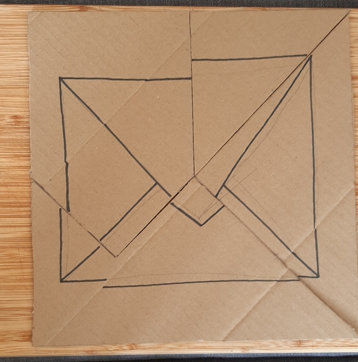 Проверила, собирается ли она обоими способами (собирается). Длина стороны квадрата – 27 сантиметров, она должна делиться на 3, чтобы было удобно отмерять разметку. В принципе, можно было бы и поменьше. С квадратом проблема, потому что если на нём что-то нарисовать, линии будут подсказывать собирающему, поэтому я рисовала криво.