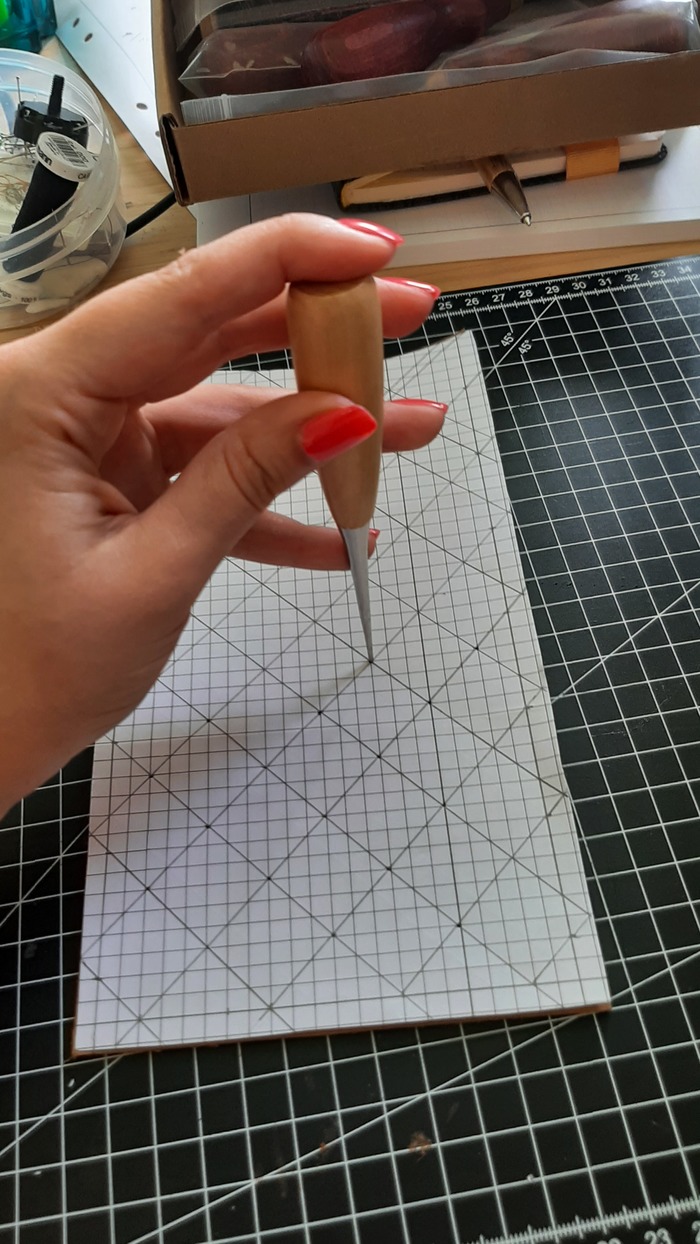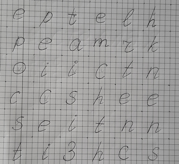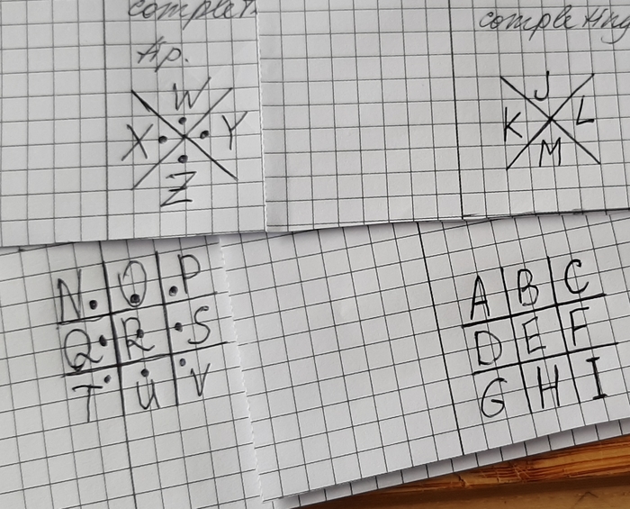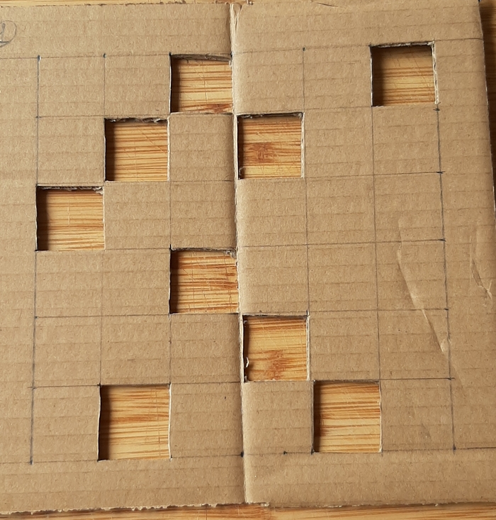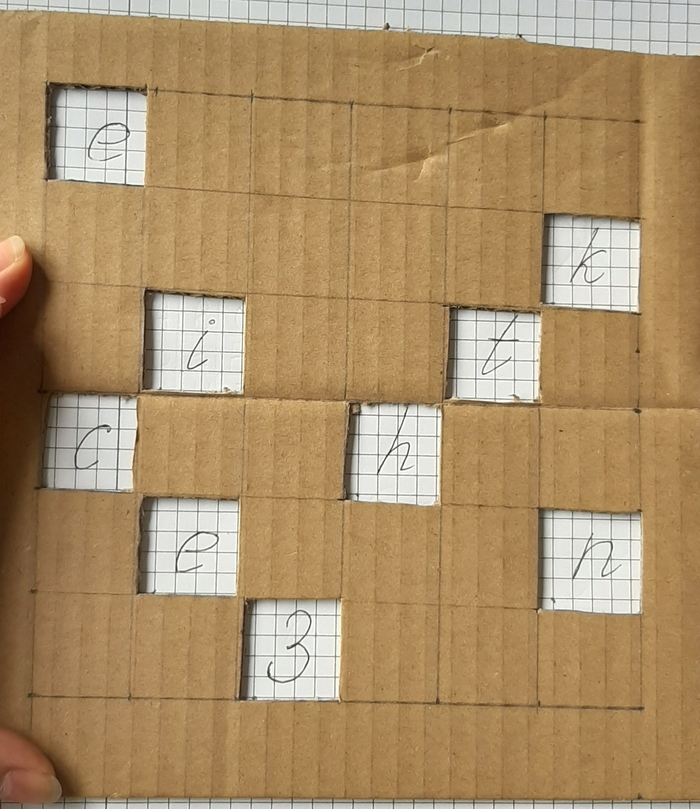 По счастливой случайности в моём шифре оказалось ровно 36 знаков без пробелов, поэтому я использовала решётку 6*6 без «мусора». Сначала начертила на бумаге, проверила, работает ли и влезает ли фраза, потом вырезала из картона.