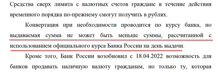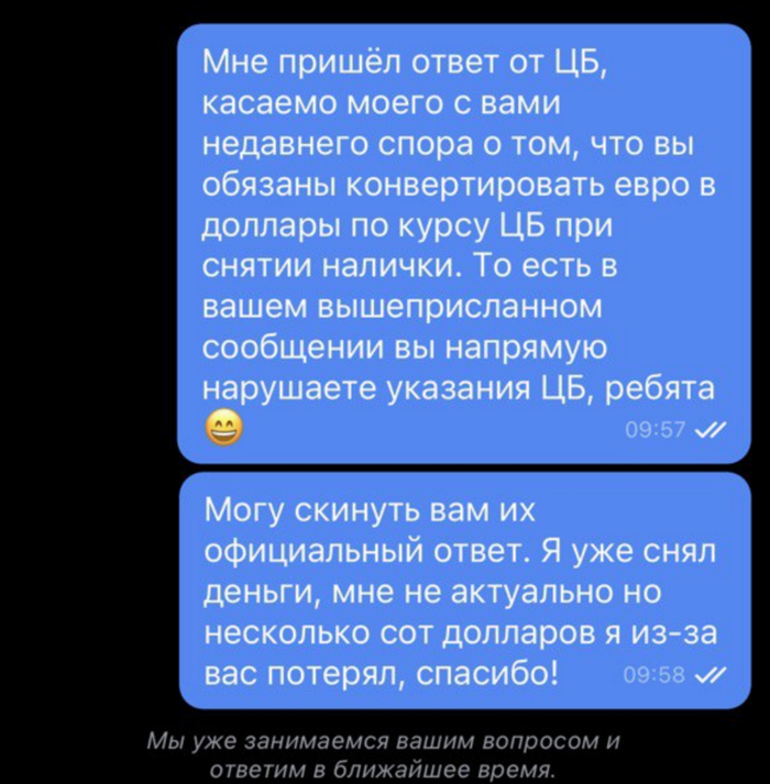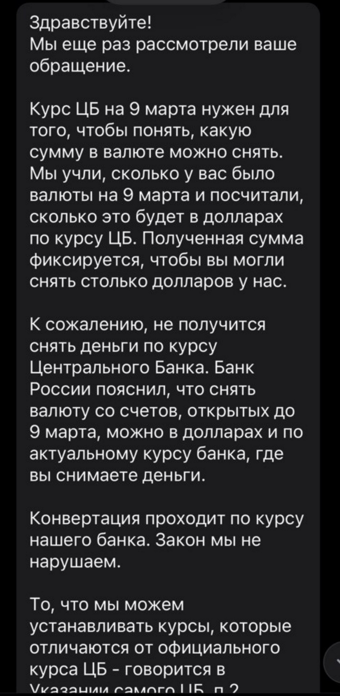 Собственно, в марте хотел снять оставшиеся евро со счета. Тогда еще действовало правило, что снимать можно только в долларах. При этом ЦБ дал указание, что банк должен конвертировать евро в доллары по курсу не ниже курса ЦБ на момент конвертации. Курс тогда был 1.1. В приложении тинькова курс 1.07. Звоню им на линию - они говорят, что им нужно время на подумать и создают обращение. Через несколько дней приходит ответ: