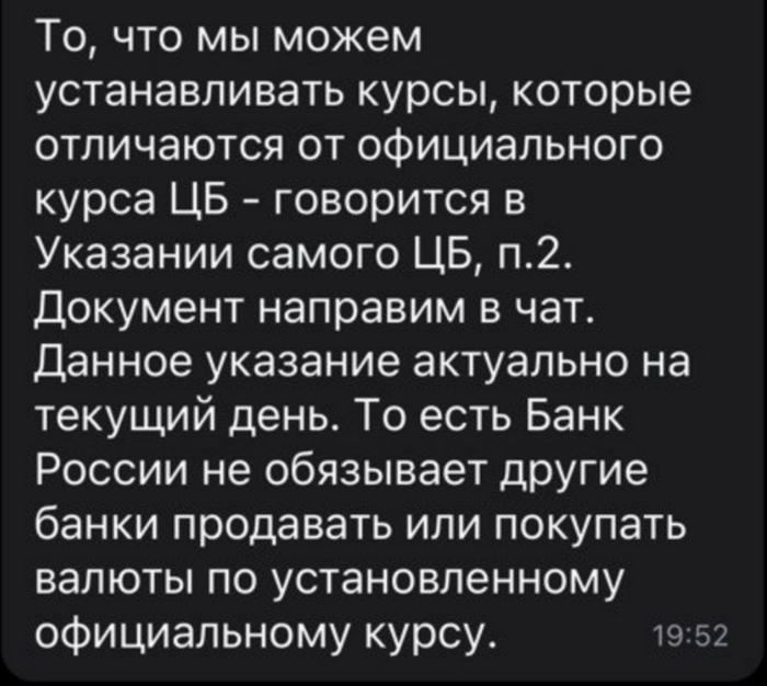 То есть, банк может устанавливать свой курс, сумма к выдаче после конвертации не может быть ниже суммы, полученной с использованием офф курса ЦБ. Пишу Тинькову снова: