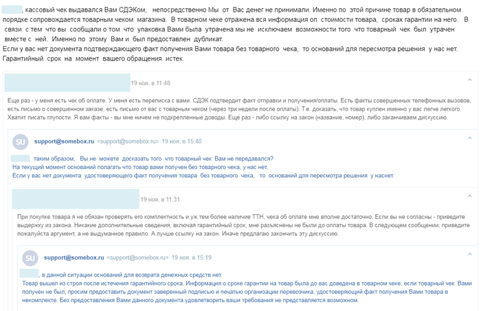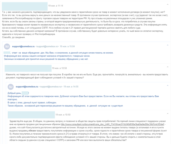 Ситуация довольно банальная - приобрел увлажнитель воздуха в интернет магазине somebox.ru. Через три недели обнаружил, что он перестал работать (пару раз пользовался сразу после покупки). Без задней мысли написал в интернет-магазин. И забыл на неделю (стоит отметить, что все это время был полностью уверен в положительном исходе решения вопроса, поэтому особо не торопился). Через неделю после первого письма уже решил позвонить в сам магазин, на озвученный вопрос по поводу моего гарантийного случая девочка посоветовала мне написать на почту сервиса (почему сразу в обратном письме нельзя было этого сделать для меня остается тайной). Что же, перенаправляю письмо в сервис. Далее прикладываю скрины переписки (читать снизу-вверх):