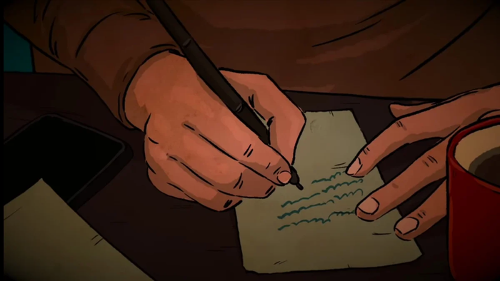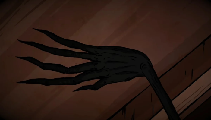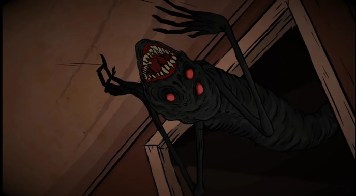 Существо смотрит на него тремя красными глазами и стои закрыть свои глаза, он слышит как оно спускается к нему и ничего не помогает, даже включённый свет, а засыпать он боится, поэтому пьёт по двадцать чашек кофе в день.