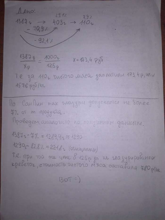По СанПин глазурь на креветках допускается до 7% от общей массы продукта. Проведем аналогию по потере массы после дефростации до очищенного состояния. В креветках 70/90 (т.е. от 70 до 90 шт в 1 кг) мы получили потерю в 82,8%. Т.е. даже при соблюдении норм СанПина мясо в чистом виде стоило бы 780 руб/кг.