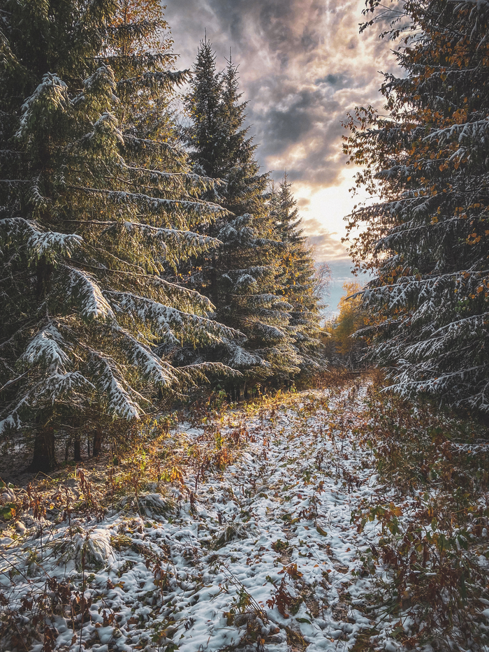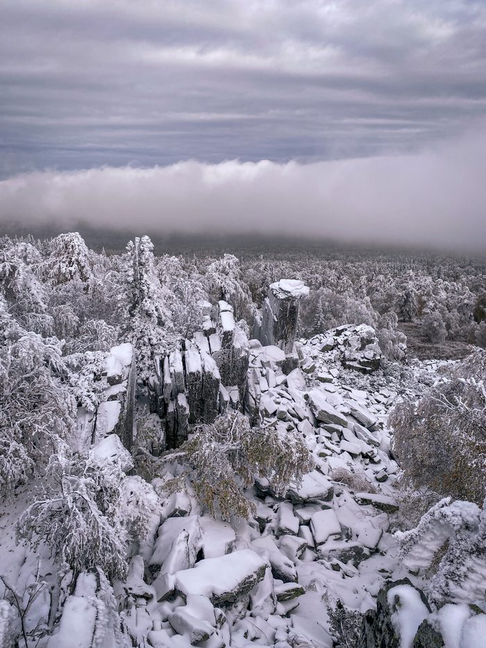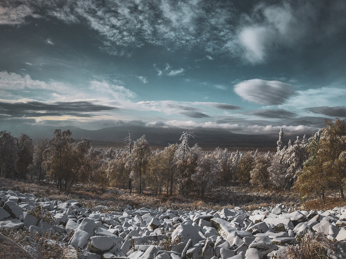 Из лета в зиму и обратно за два дня - запросто в наших-то краях))) Пока внизу переодически льёт осенний дождик, а наверху валит снег, мы решили прогуляться до одной малопосещаемой вершины в южной части хребта Уреньга. Маршрут начался от кордона «У трёх вершин» в национальном парке Зюраткуль. Тут ещё в некоторых местах зеленеет трава, тепло и пасутся лоси, которые издают какие-то непонятные звуки(учитывая, что сейчас вроде как время гона, то они заставляют задуматься))) Ну а затем вверх на перевал между Большим и Средним Нургушом. Выше уже снега попадается больше, а на самом перевале его уже сантиметров десять. Очень красиво смотрится на разноцветной листве, которая ещё не опала с деревьев, да и трава полегла далеко не везде. Спуск в долину реки Березяк пологий и приятный. Учитывая, что почти весь поход проходил по старым дорогам, удивляло их неплохое состояние, для ходьбы самое то. Лагерь поставили на берегу, речка здесь совсем небольшая(исток всего в 3,5 км выше по течению), но очень красивая и атмосферная. А дальше налегке ещё почти 6 км до вершины горы Еловда(1116м). Причём, чем выше поднимаешься, тем больше меняется природа на стандартные уреньгинские виды: много лиственниц причудливой формы, выворотни, небольшие болотца. Сама гора несложная, но красивая: пара курумных ступеней, низкорослые березы и россыпь камней на вершине, причём некоторые очень правильных геометрических форм, прям пища для мозгов альтернативно одаренных личностей))) По пути назад даже немного выглянуло солнце и виды стали ещё более офигительными. Вечер по стандартной программе под журчание Березяка и тишину осеннего леса. Следующий день уже намного теплее, а спустившись с Нургуша в долину Калагазы вообще ощущение, что попал обратно в лето, как будто и не было всех этих заснеженных видов буквально вчера)