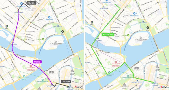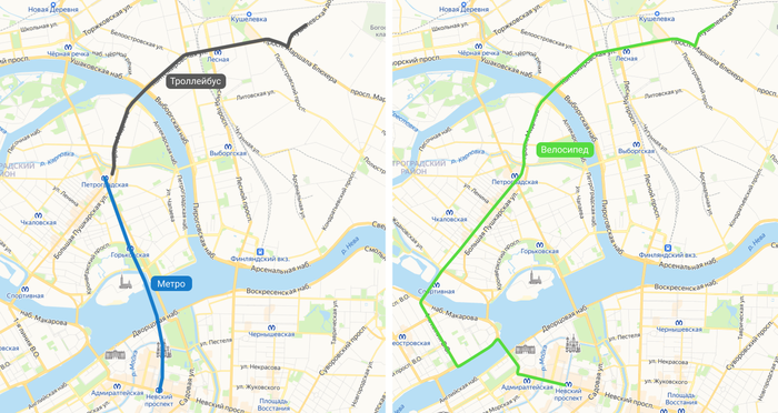 Первое время добираться мне нужно было из новых жилых комплексов на Кушелевской дороге (метро "Лесная" / "Площадь мужества"). Кратчайший маршрут на общественном транспорте выглядел как-то так: пешком до остановки, потом на троллейбусе до "Петроградской", потом на метро. Со всеми спусками, подъёмами и переходами занимало у меня это дело ~ 50 - 60 минут.