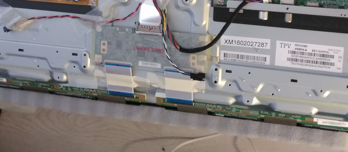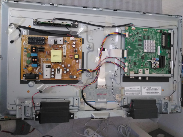 Смотрим на кишки, боимся, смотрим ещё раз, берем себя в руки и продолжаем. Мануал не предполагает замены только подсветки и при неисправности экрана рекомендует полностью его менять (ага, как же!) и предлагает отсоединить и снять все платы. Ну нет, не наш путь. После некоторых рассматриваний находим шлейф матрицы. Чтобы до него добраться, нужно снять динамики и металлические скобки, к которым крепятся ножки телевизора. В нашем случае, ещё и маленькую плату с ИК датчиком и светящимся логотипом. А вот и шлейф: