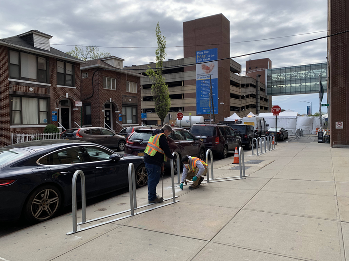 Возле госпиталей устанавливают дополнительные велопарковки, чтобы врачам удобнее было добираться до работы.