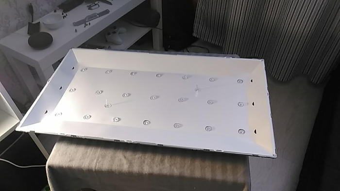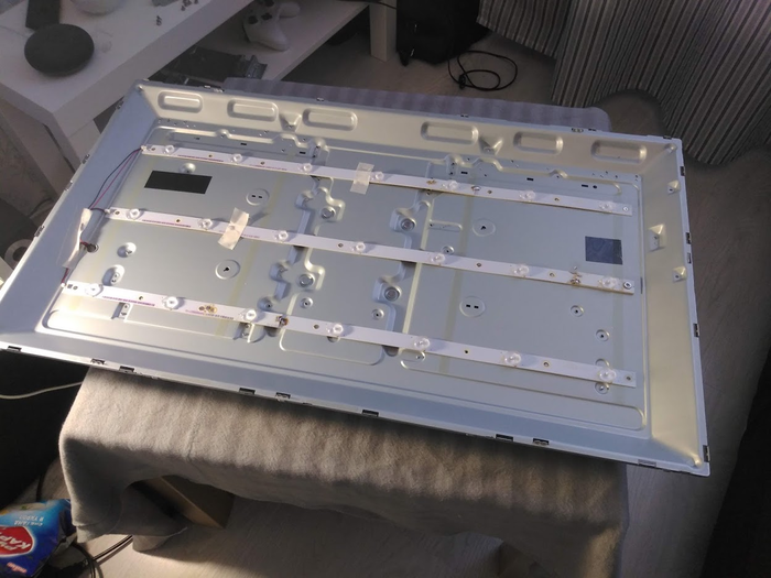 Думаю, заменить подсветку полностью я решил не зря. Осторожно отключаем все три планки, откручиваем и заменяем на свежие. Осталось правильно собрать. Повторяем в обратной последовательности все шаги, ставим телевизор, и молимся всем возможным богам... Работает!