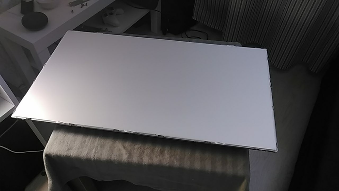 Аккуратно отсоединяем его, боясь лишний раз вздохнуть. Потом откручиваем винты, которыми передняя рамка и матрица крепятся к корпусу. Переворачиваем телевизор и с максимальной осторожностью снимаем матрицу и перекладываем на другой стол, предусмотрительно застеленный пледом. Осталось слой за слоем снять различные рассеивающие и/или поляризующие плёнки. Устанавливать на место их потом нужно строго в том же порядке.