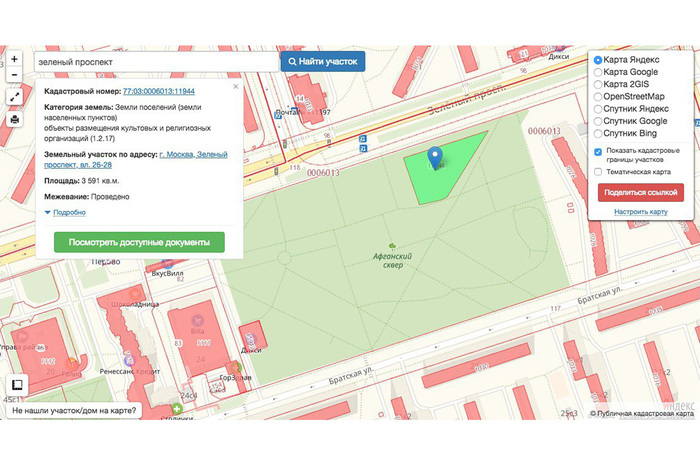Открыв кадастровую карту, мы обратили внимание, что большинство районных скверов не внесены в кадастровый учет. По сути, это означает, что такого участка не существует и строить на нем что-либо запрещено. Аналогичная ситуация сложилась и на территории Афганского сквера. На скриншотах видно, что единственный размежеванный участок в парке — это земля, предназначенная для размещения религиозной организации.