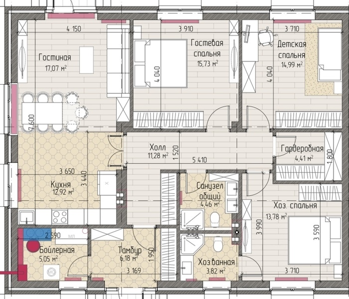 Планировалось совместное проживание родителей, поэтому стоял выбор: либо одноэтажный дом, либо обязательное наличие спальни на первом этаже, но в этом случае на втором этаже было бы 4 комнаты, а это уже было лишним.