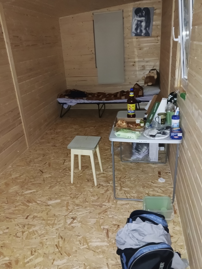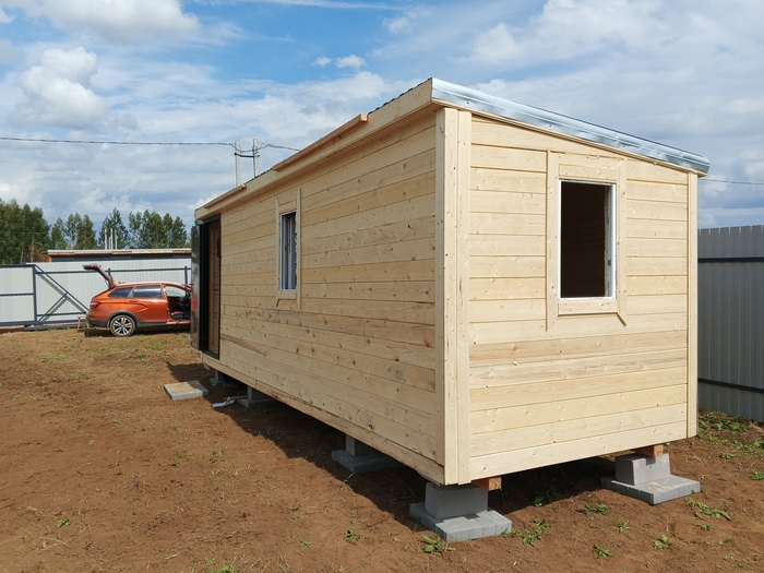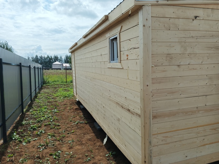 Бытовка 7х2.3м, внешняя отделка имитация бруса, крыша односкатная, из профлиста. Внутри стены и потолок вагонка, полы ОСБ. Три окна: два 60х90 в комнате 12м2 и одно маленькое (которого, кстати, не должно было быть) в с/у (1,2х1м). Ну и тамбур есть, по размерам как с/у. Утепление 100мм напыляемым утеплителем (которого, видимо, не пожалели и он из всех углов торчит).