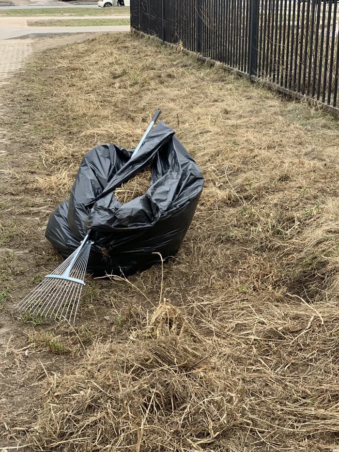 Не очень просто собирать всё в мешки, но и тут мусор «помог». Нашла кусок арматуры, прижав им мешок, собрать всё граблями намного проще.