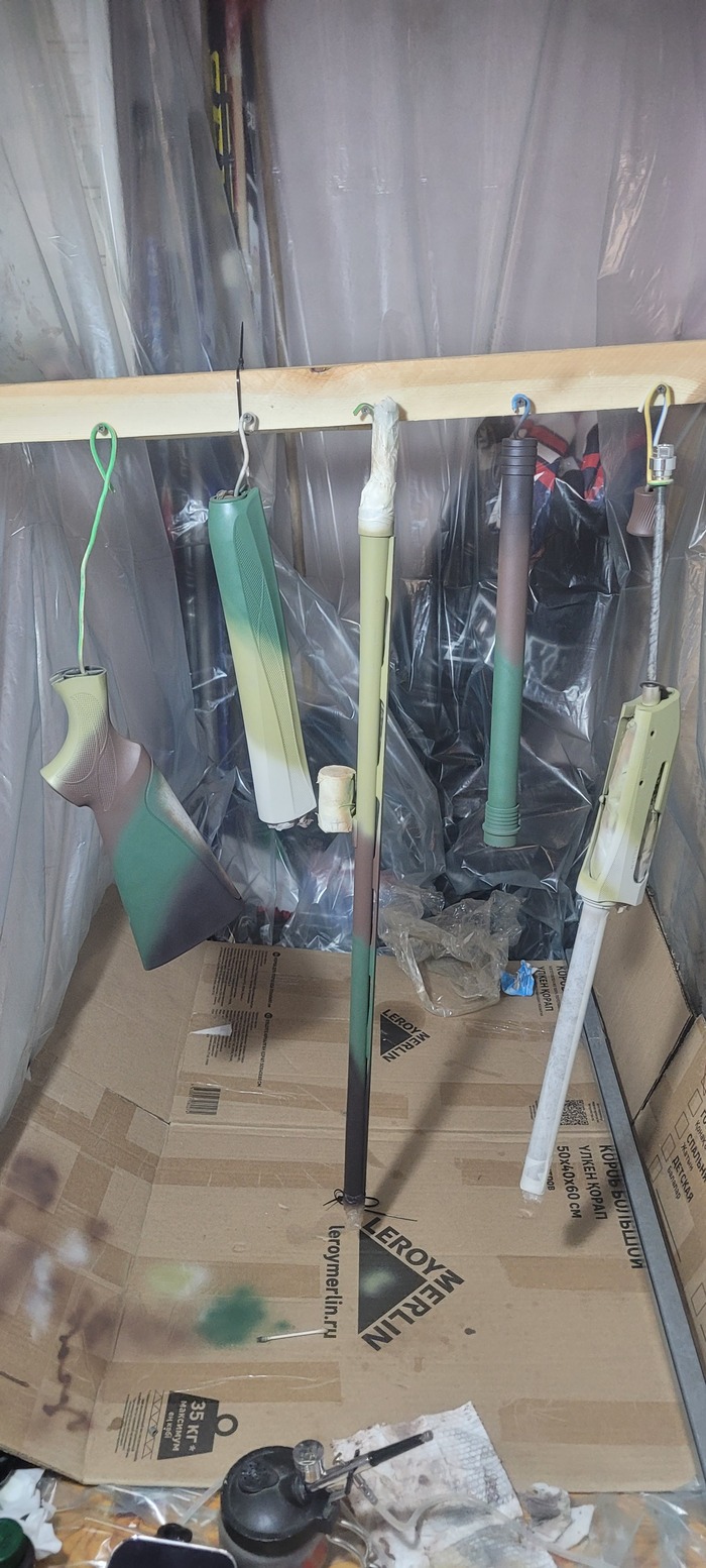 Всё разобрал, некоторые места закрыл скотчем, навкшал крючков, подготовил рабочее место, взял аэрограф у жены и понеслась... Сначала покрыл все коричневым цветом