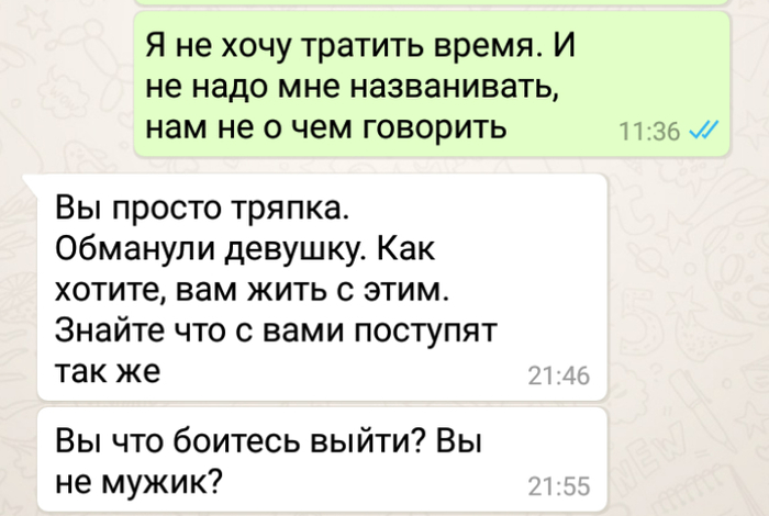 Вечером эта женщина снова мне названивает. Я беру трубку и она в приказном тоне говорит мне спуститься, она приехала. Тут я уже не выдерживаю и шлю ее нахуй. Ну а дальше начинаются оскорбления в мой адрес и конечно же что я не мужик.